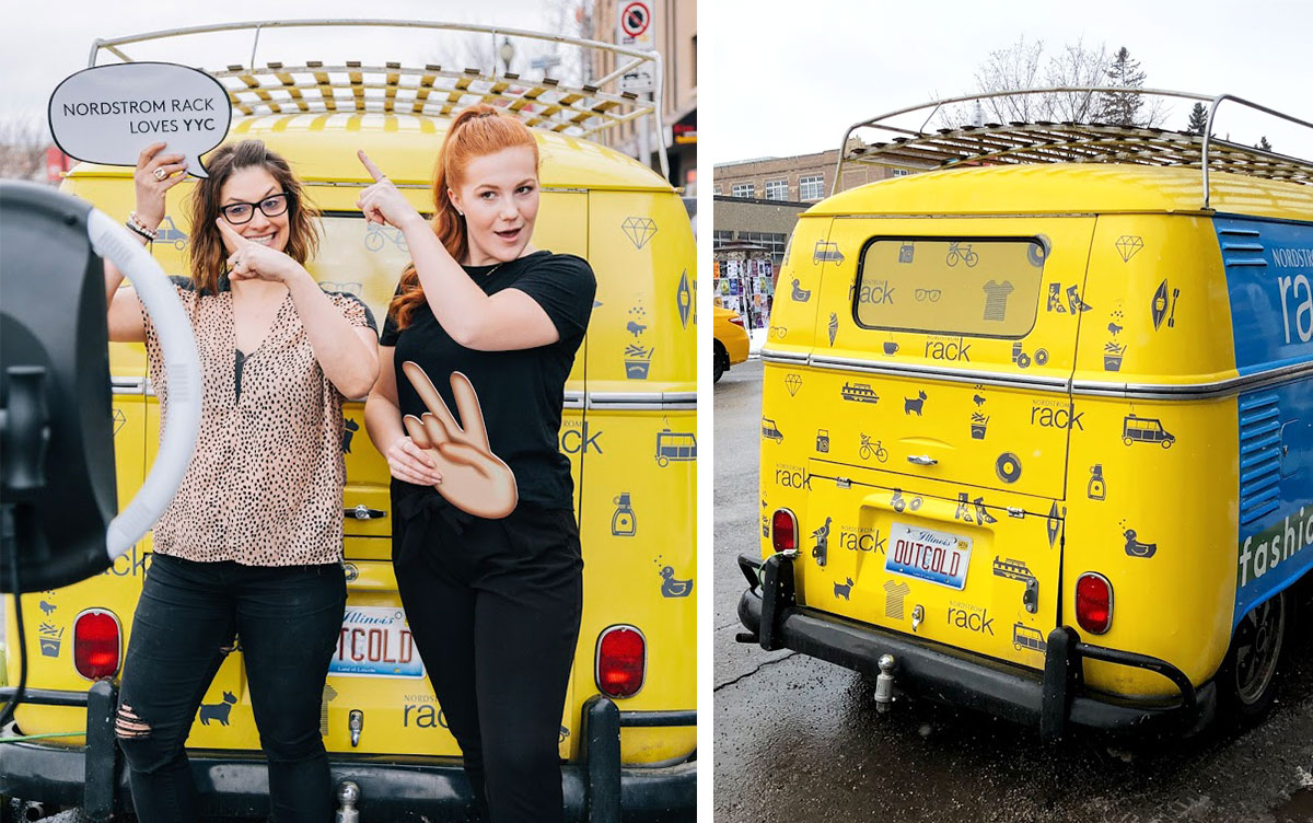 The rear of the bus was used as the photo booth backdrop and utilized Calgary- and fashion-related icons that were part of the Calgary store's evergreen graphics.
