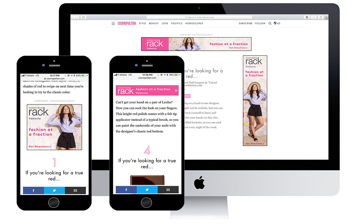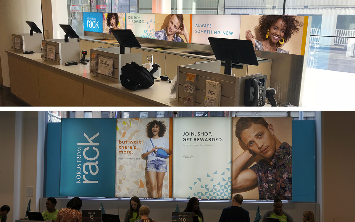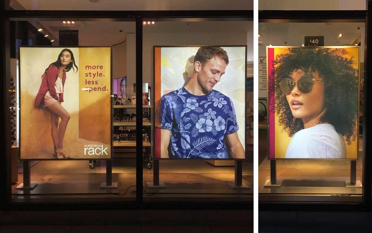 For Nordstrom Rack's summer 2018 campaign I developed the design treatment that was applied to all of the marketing and was responsible for the design execution of the in-store signage (rolled out to the 239 stores in the U.S. and Canada) and much of the digital advertising. Campaign photography was the featured element in all and since half of it was shot in front of a playful mosaic wall, the marketing message was incorporated using simple, bold typography. Translucent stripes were added to complement or enhance color in the photography and sometimes act as a border or framing element.