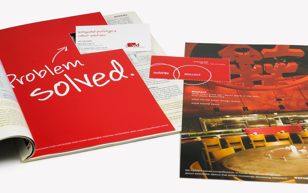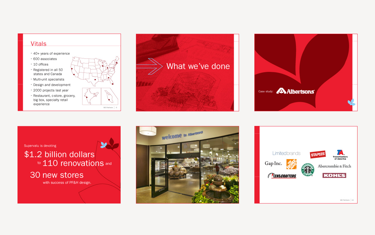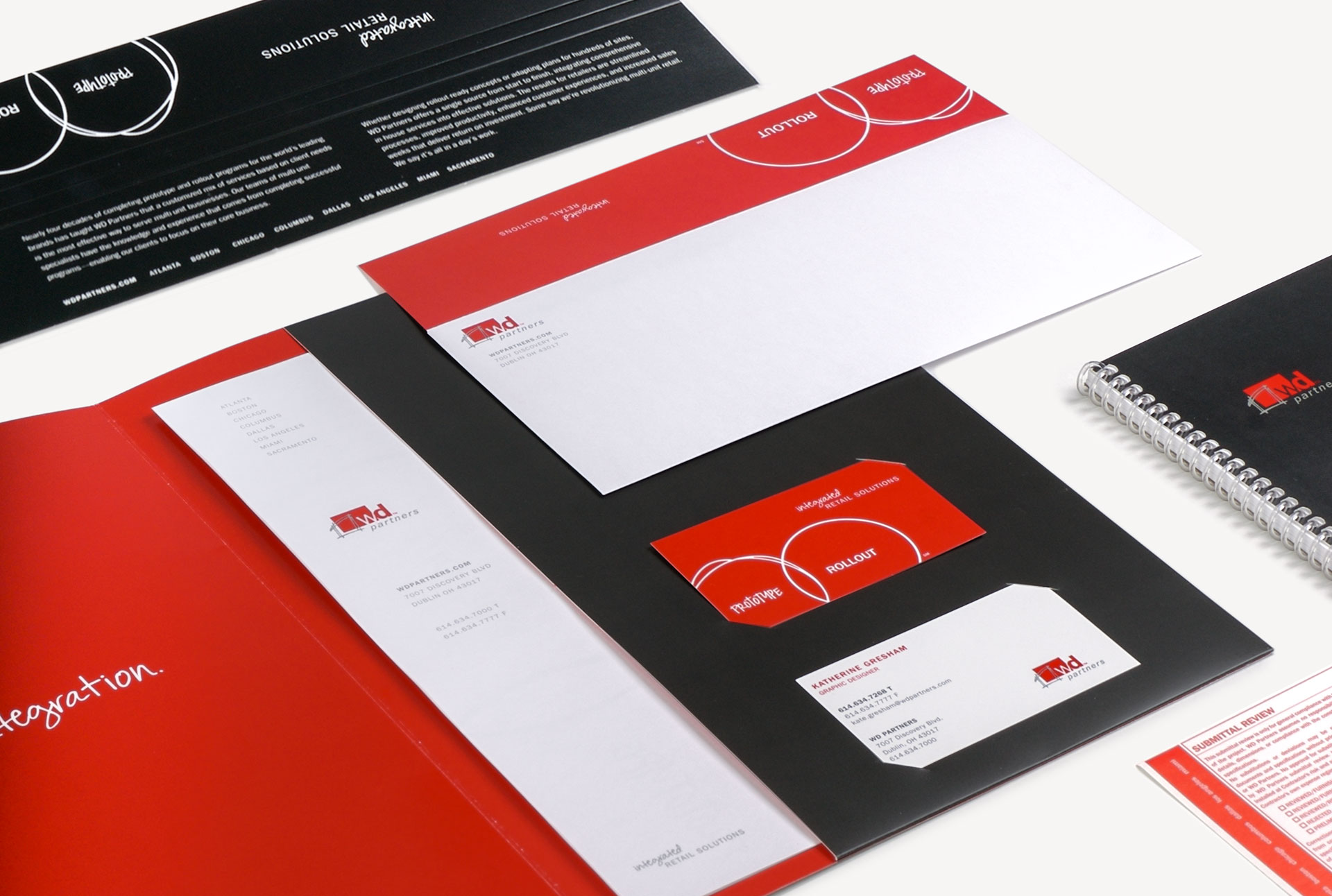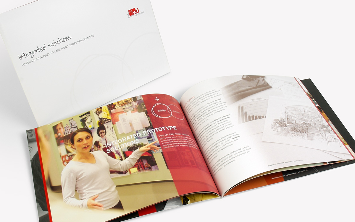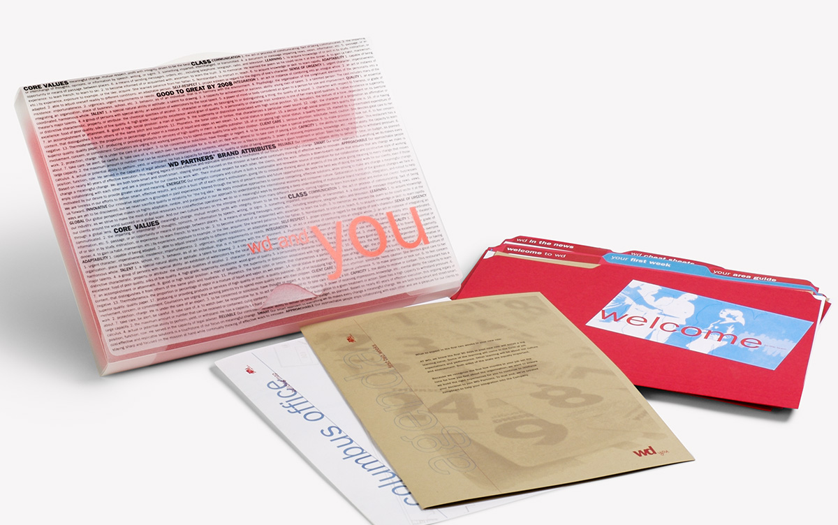 While at WD Partners, a retail design and architecture firm for national multi-unit brands, I was the lead designer in the effort to evolve the company's visual identity. The WD logo ultimately remained untouched, but the primary and secondary color palettes were refined, a handwritten typeface was created to complement the brand's primary typeface, and graphic elements were developed to further expand the visual brand assets. Guidelines for the type of marketing photography that could be used were also established. All internal and external company materials were subsequently redesigned, samples of which can be viewed below.