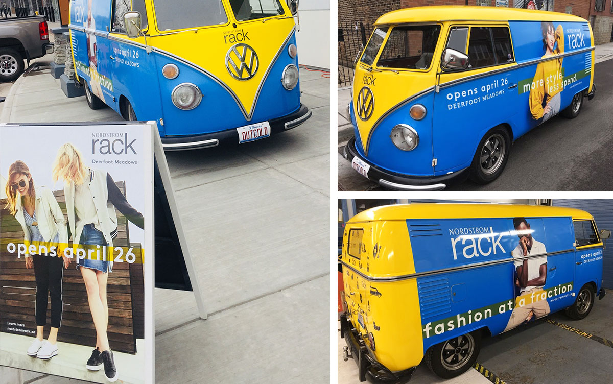 VW promo bus wrap and menu board. The bus acted as a moving billboard to promote the impending store opening. It included a photo booth and made specific stops around Calgary to hand out Rack promo merchandise and coupons
