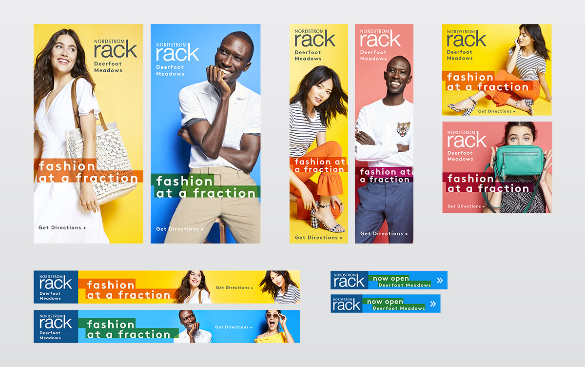 Nordstrom Rack opened its Calgary, Canada, location in April of 2018, and a marketing campaign was implemented to generate buzz and create brand awareness before and after the opening. My role was to design all of the digital ads, as well as graphics and signage for a VW promo bus. Photography shot on vibrant backgrounds was primarily used so that the advertising stood out whether it was on a bus or sandwiched within the content of a web page. The store opening info was highlighted on equally vibrant horizontal stripes that were translucent in order to add depth and some airiness to the design.