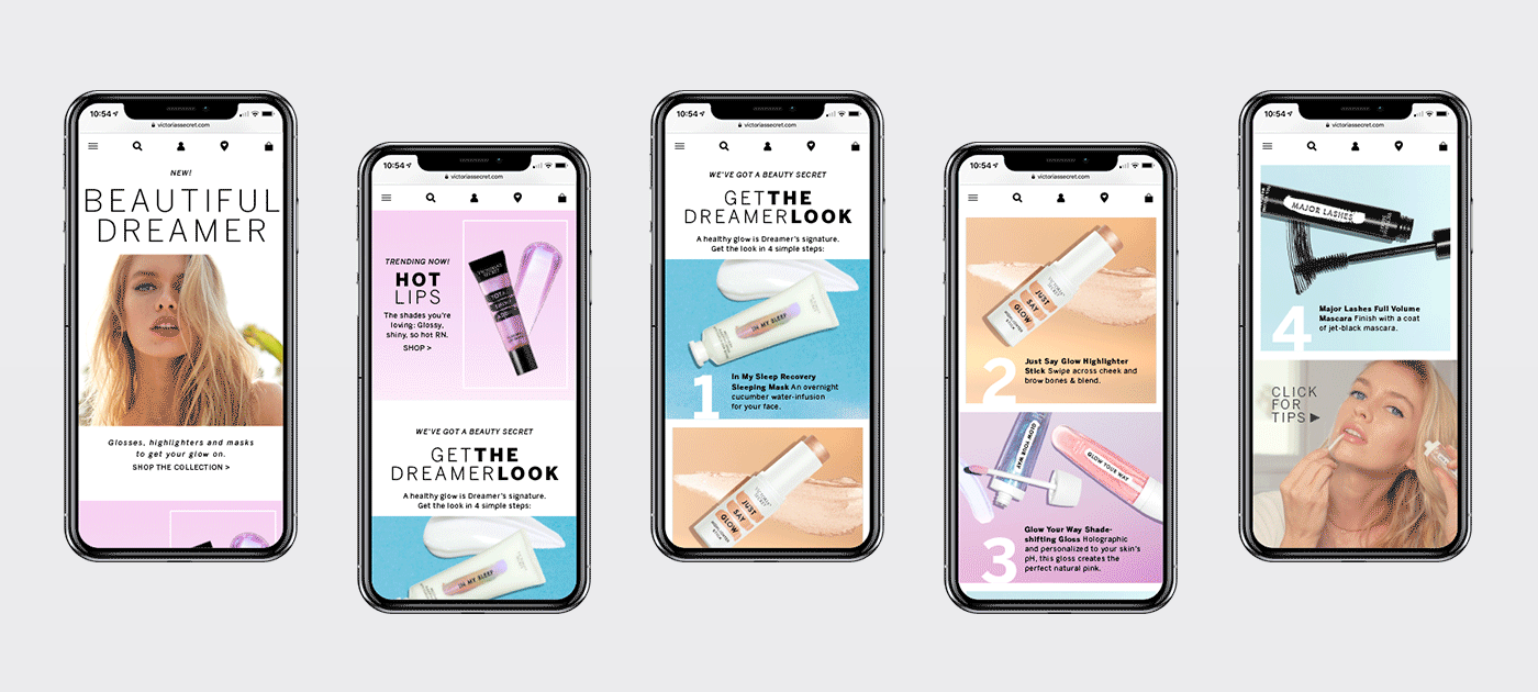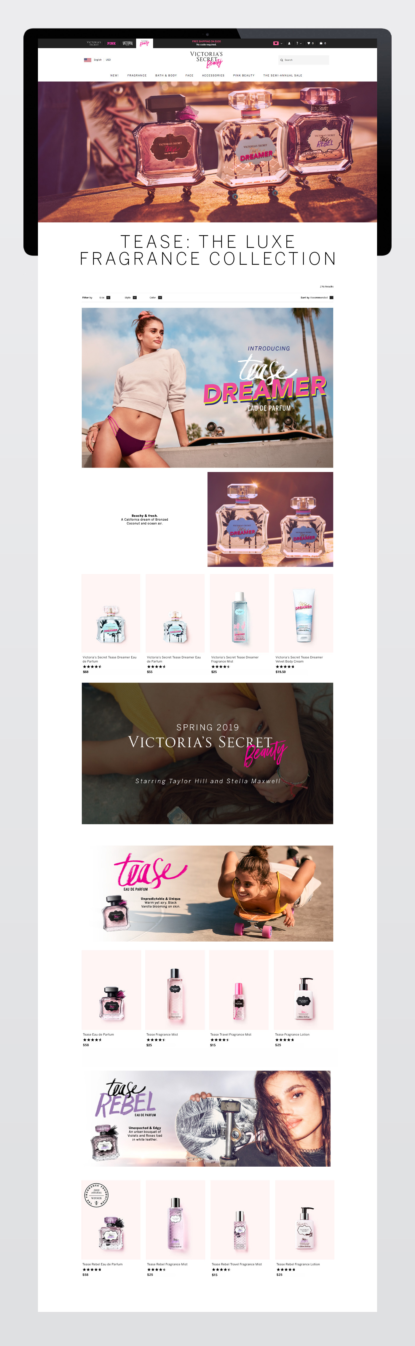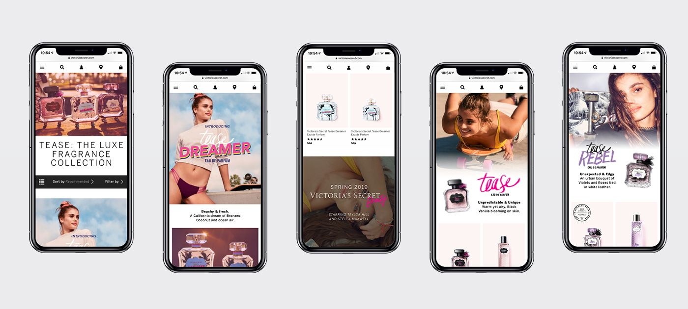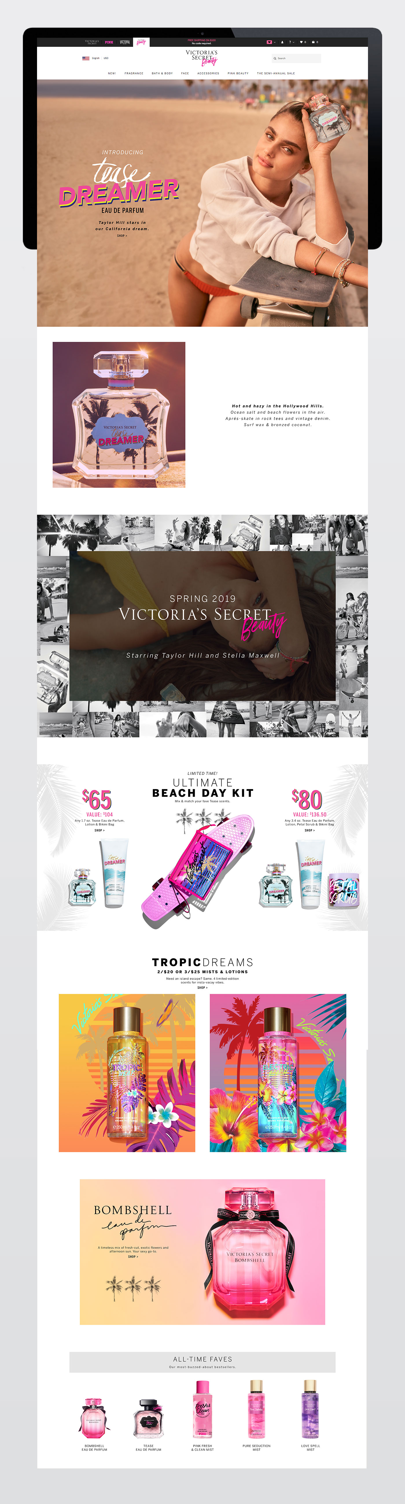 The Beauty Tab underwent a visual transformation in late spring 2019 with the launch of a new Victorias's Secret fragrance called Tease Dreamer and corresponding beauty products and accessories. Its landing pages went from having pink-striped backgrounds framed by neon-tinged floral illustrations to using more generous amounts of white space with photography as the main visual element. Headlines previously designed with serif and handwritten fonts were instead typeset with a mix of thin and bold sans-serif fonts. What follows is some of the work I did as a web designer on the beauty creative team during this time period.