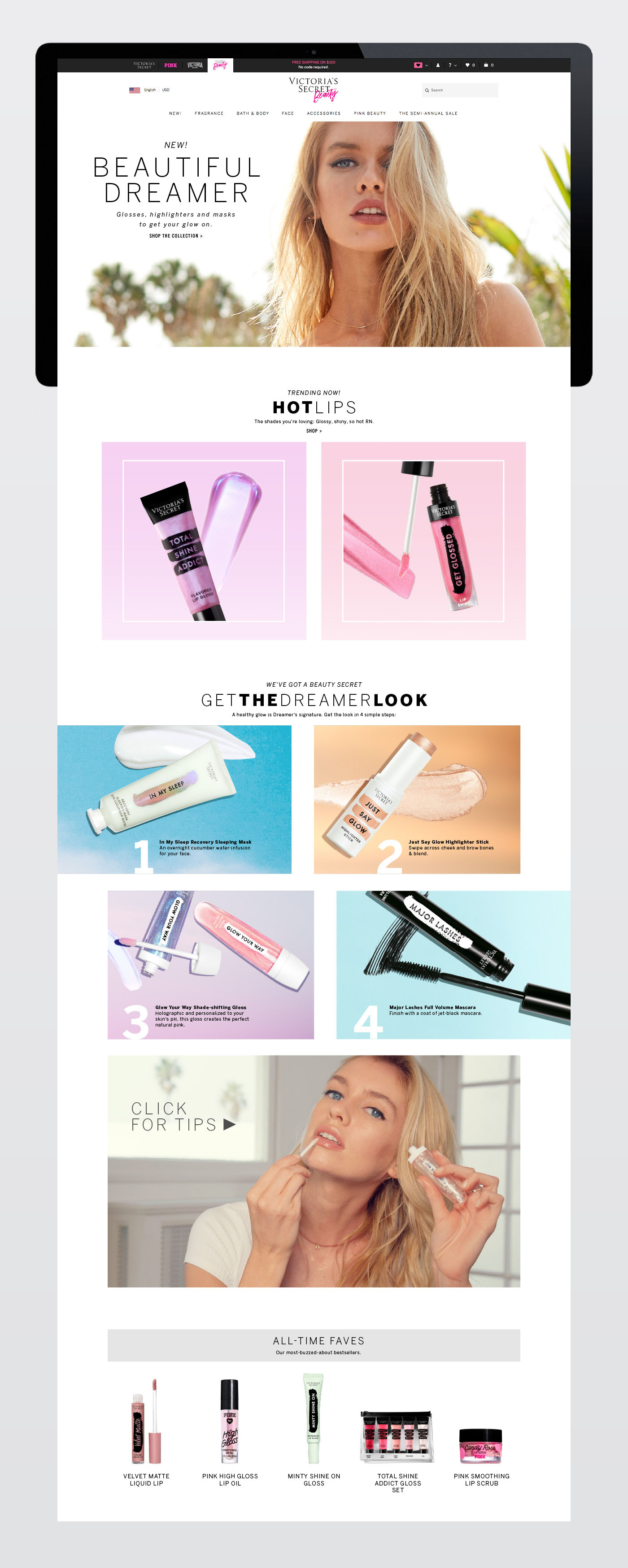 The Face landing page during this time period focused on beauty products and tutorials that would help customers get the look used on the two Tease Dreamer models featured throughout the Beauty Tab.