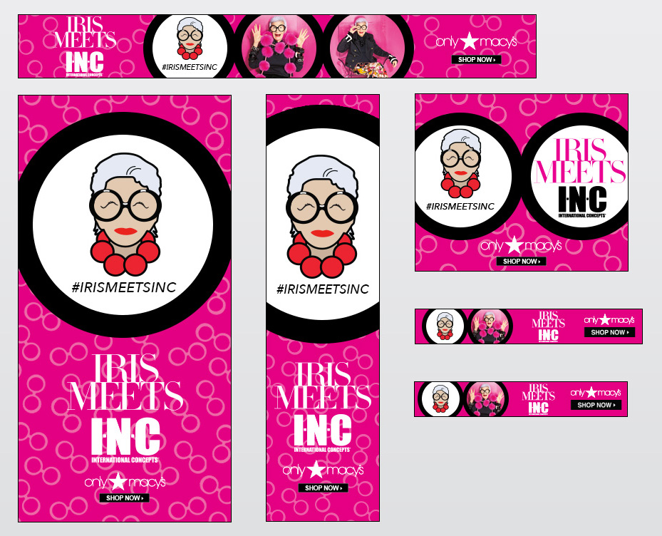 INC International Concepts, Macy's top-performing private label fashion brand, collaborated with fashion icon Iris Apfel for its fall 2016 collection. She curated the collection and starred in both facets of the marketing campaign—one promoting the collection and the other an Apfel-inspired emoji keyboard pack. Both tapped into the personal style of their cover girl by incorporating elements such as her signature round black glasses, which bubble up into the background of the fashion collection ads or magnify elements in a jumbotron video promoting the emoji pack. An emoji of Iris and the color hot pink are other impactful elements that were also woven into the campaign.
