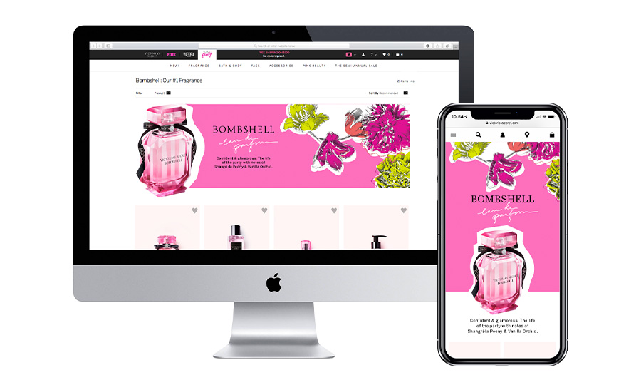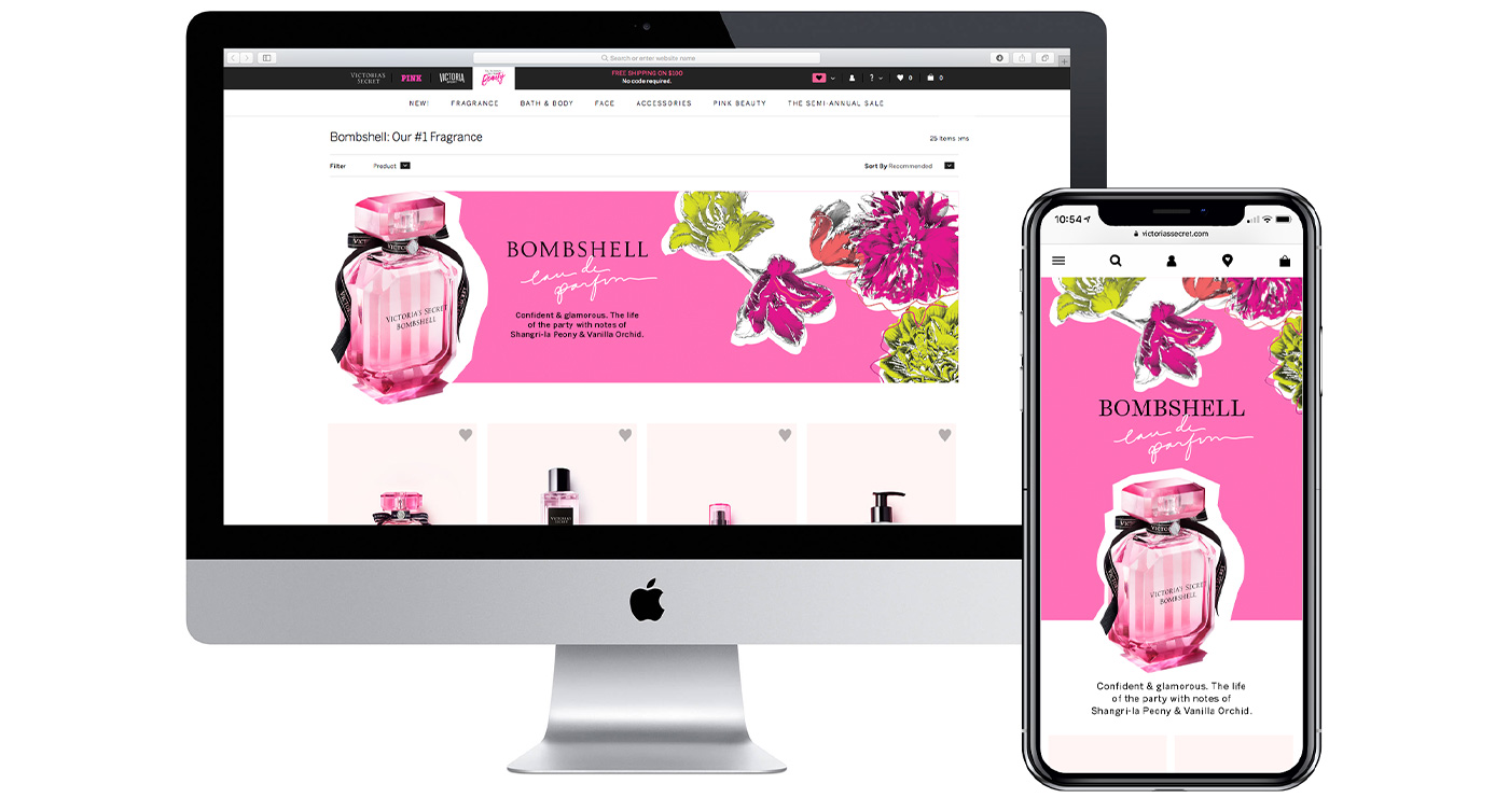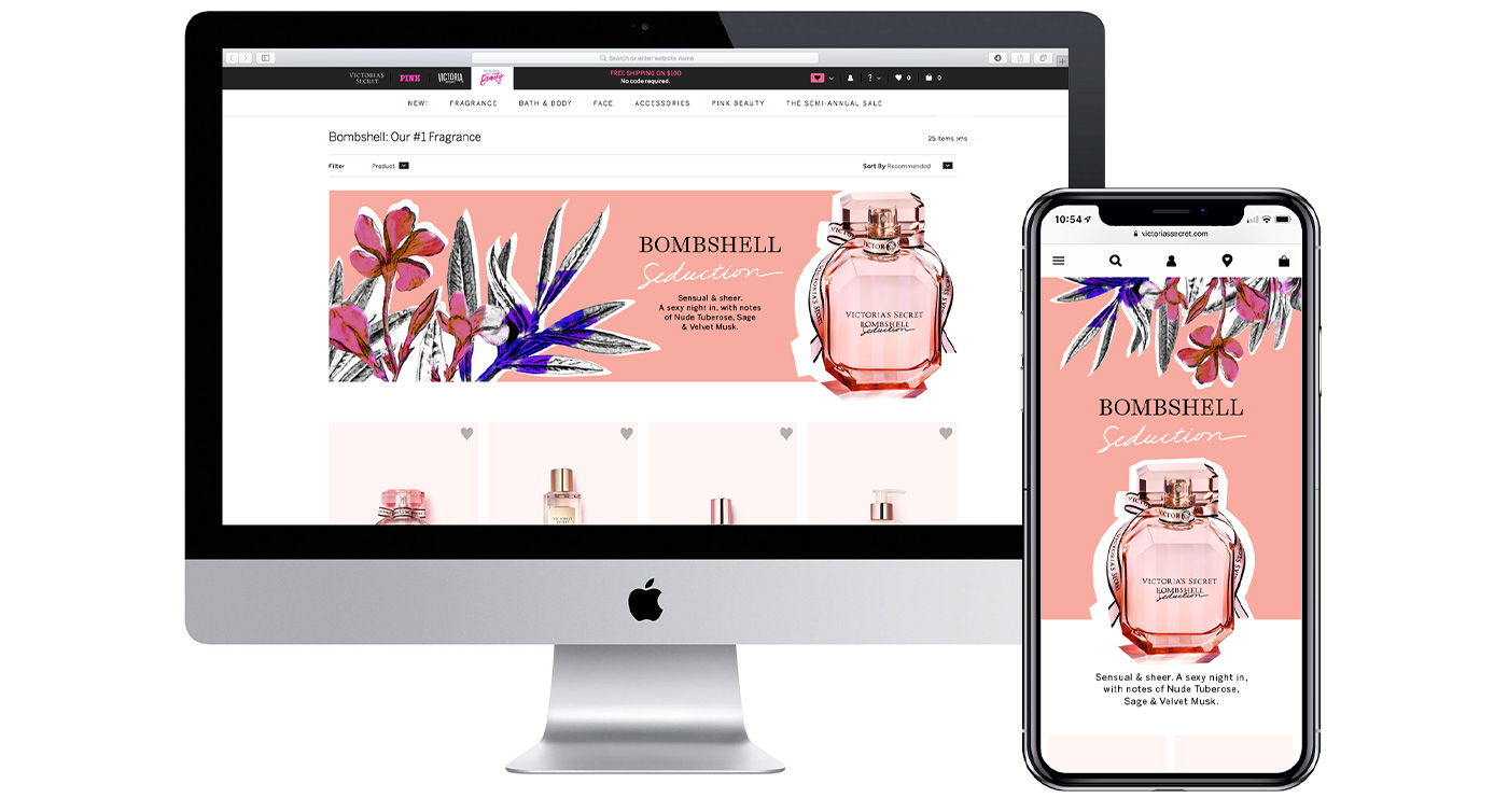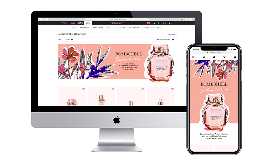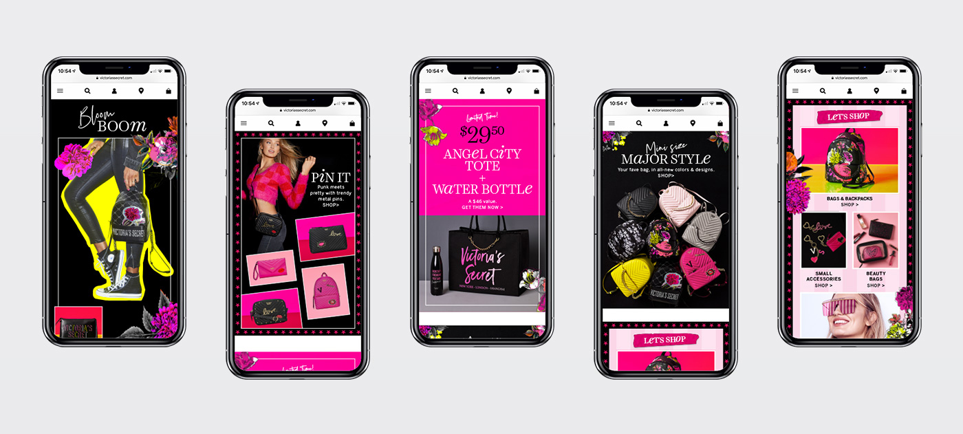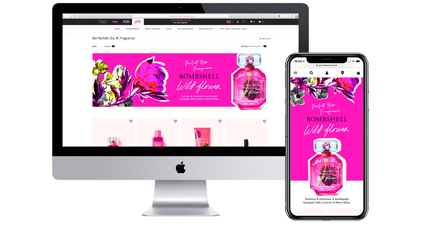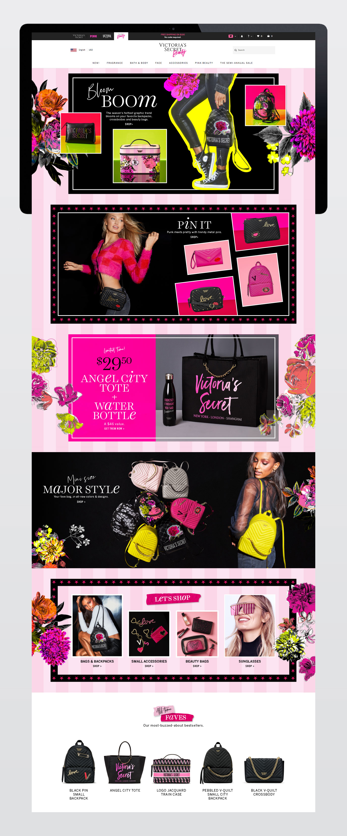 The Beauty Tab on the Victoria's Secret e-commerce site sells beauty products as well as accessories. In spring 2019, a new fragrance called Bombshell Wildflower and a line of floral-print accessories launched. For the launch, the in-store environment and beauty site were transformed to incorporate VS's signature pink stripes as a backdrop, flower illustrations, a neon color palette, and a playful mix of serif and handwritten typefaces. What follows is some of the work I did as a web designer on the beauty creative team during this time period.